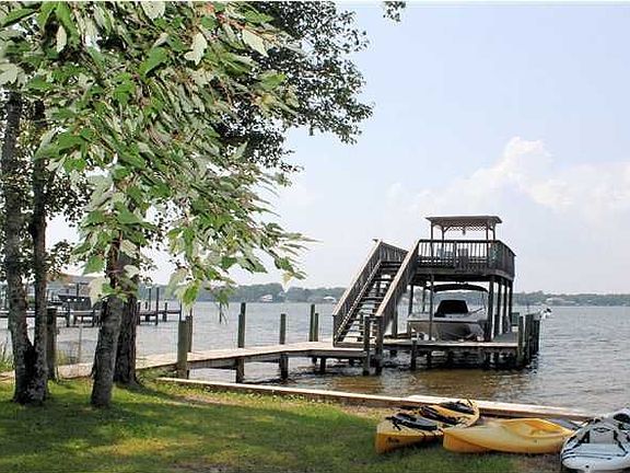 Own your own piece of waterfront property on the beautiful & pristine shoreline of Rocky Bayou! This very special waterfront gem has so much to offer, starting w/the deep water dock, covered boat slip w/a 6000 pound boat lift & a 25x14 ft. sun deck above... perfect place to relax and take in the magnificent sunsets year around! Hours will also be spent entertaining on the over than 1000 square feet of 3 tiered decking on the back of the home. The main level of the decked area (42x14) is covere d and includes a fabulous 6-person hot springs therapeutic hot tub, as well as 3 ceiling fans & cable television & stereo connections! Maintenance free exterior is brick, stone & vinyl...and the roof has top quality three dimensional shingles! Ther e are three levels to this home, including the ''walk-out'' daylight basement that features a family room w/fireplace, rec room w/pool table, efficiency kitchen, full bath, office, and storage room. The main level of the home has a lovely dining and living room w/a stone fireplace, and Bruce hardwood flooring, plus the remodeled eat-in kitchen featuring all stainless steel Kitchen Aid appliances and granite countertops. The master bedroom is on the main level and has access to the covered deck. The second story has three bedrooms and two baths... Oversized two car garage is heated and cooled but not included in the square footage. Included in the sale of this home are the pool table, hot tub, large freezer in the garage, and the washer & dryer. New roof in 2005, new 4.5 ton heat pump & air handler recently installed. Square footage taken from the public record with the heated and cooled walk-out basement included. This truly is a beautiful piece of waterfront on Rocky Bayou...MOTIVA TED SELLER - PRICE HAS BEEN SUBSTANTIALLY REDUCED...