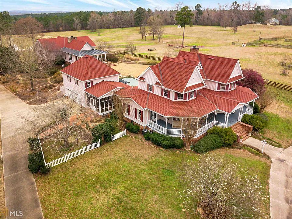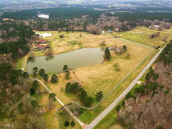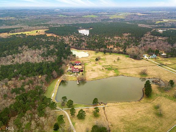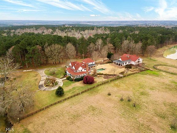 The Former Estate of Diane Smith McIver and Claud L. "Tex" McIver, III, aka "The Ranch". The two-story 3-bedroom custom home overlooks a large stocked lake. Home features a den with a massive brick fireplace, custom mantle, cabinets, entertainment center and bookshelves. The dream kitchen is outfitted with granite countertops, custom cabinets and professional grade appliances. The main level also features a study, formal living and dining rooms, full bath and mud room. The upper level features a spacious master suite and bath with double marble vanity and a large custom closet. An additional bedroom and full bath complete the upstairs. A screened-porch overlook a gunite pebble tech swimming pool and flagstone pool deck.The pool area is accented by a double-sided fireplace and custom outdoor kitchen with ample storage with state-of-the-art outdoor appliances. The two-story 2-car garage features an upstairs finished living area, full kitchen and bath, large closet, attic storage, and a media room; equipped with a Sony projector and screen. An additional entertainment venue is an authentic saloon with a kitchenette, half-bath, and a master suite with a deck overlooking the back forty. A wine cellar with cedar wine racks, a testing table, a sink and dual thermostats completes the venue. The saloon also features a mirrored fitness room, a two-stall horse barn with tack room, feed-room, workshop, utility washroom, two hay lofts and paddock. The property is comprised of mature Georgia pines, massive oaks and lush fenced and cross-fenced pastures with a four-board split rail fence along Pea Ridge Road, and is punctuated by an additional stocked pond, a horse-riding ring, a walking corral, and an equipment barn.