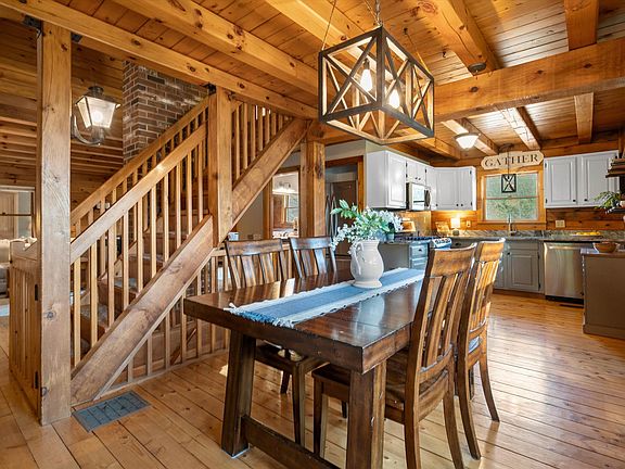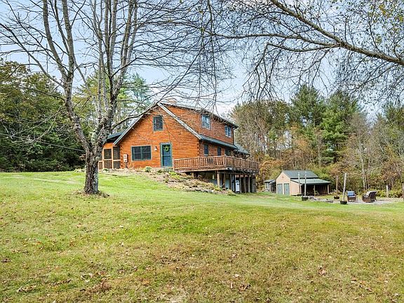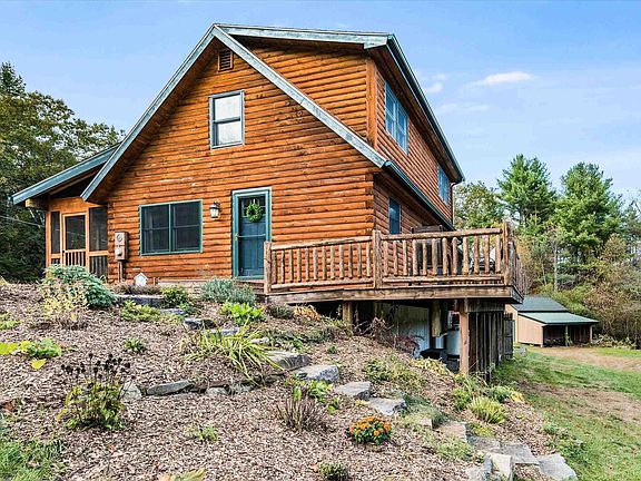 QUALITY CRAFTSMANSHIP AND MOUNTAIN SERENITY…YOUR STORYBOOK LOG HOME HAS ARRIVED! Set on rolling green acreage framed by mountain vistas this picture-perfect retreat offers year-round enjoyment. A screened farmer’s porch with hand-hewn beams invites you to unwind with a drink as the sun melts into western hills. Inside, wide plank floors, rich wood paneling and an open, light-filled layout create a sense of warmth and welcome. A symphony of wood, brick and glass create architectural appeal. Gather in the living room for conversation then prepare appetizers in the beautifully designed kitchen where dual-tone cabinetry and granite surfaces impress. After memorable meals in the dining room, adjourn to the elevated deck to stargaze or greet panoramic sunrises over Surry Mountain with morning coffee. Screen a movie in the rec room on the ground level where a bathroom and abundant space await your imagination. Throw open doors to access the back yard and magical fire pit for s’mores and stories or head to the insulated barn where a workshop invites hobbies and creativity. After a day spent swimming, fishing, hiking, skiing or snowshoeing nearby, relax in the first-floor primary wing to soak sore muscles in the tub and tuck into bed as the moon rises over the mountain. Upstairs, two generous bedrooms will please everyone and a charming finished attic offers flexible space for work and play. This is such a special home! A PRISTINE AND THOUGHTFULLY CURATED HAVEN FOR ALL SEASONS!