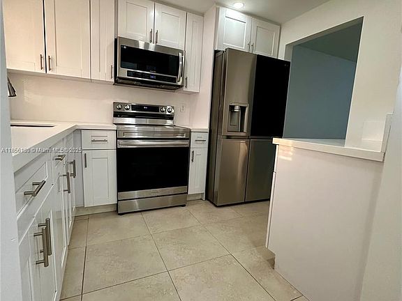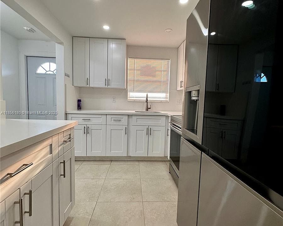Shaker-style cabinetsEnclosed balconyQuartz countertopsModern kitchenTile flooringSpacious layoutStainless steel appliances