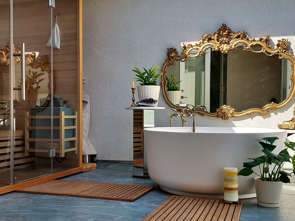 -private spa courtyard: with 7 ft high privacy walls, sauna features chromotherapy & Bluetooth speakers, oversized freestanding bath tub for hot soak or ice bath (your freezer auto-fills 2 ice buckets)