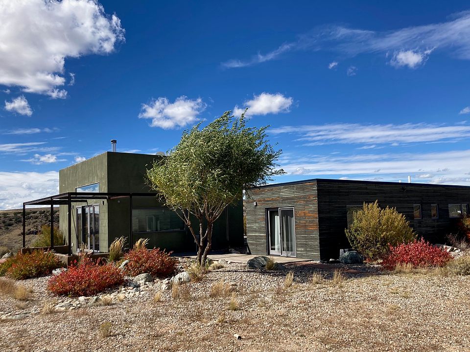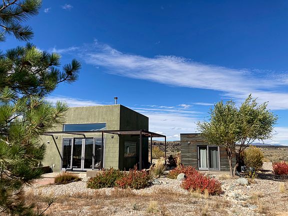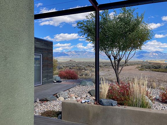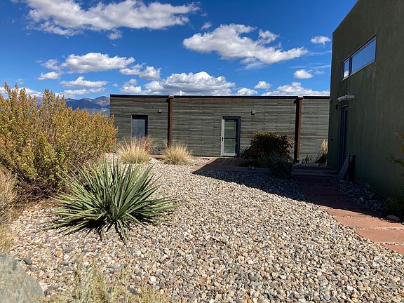 Picture windows offer views of the Sangre de Cristo Mountains to the east and the Rio Grande Gorge to the west. Outdoor decks and stone pathways connect the main house to a separate building with a 2nd bedroom/office, bathroom, and cedar sauna. On the far end of the black building is a laundry room with washer, table, and stash of outdoor lounge chairs.