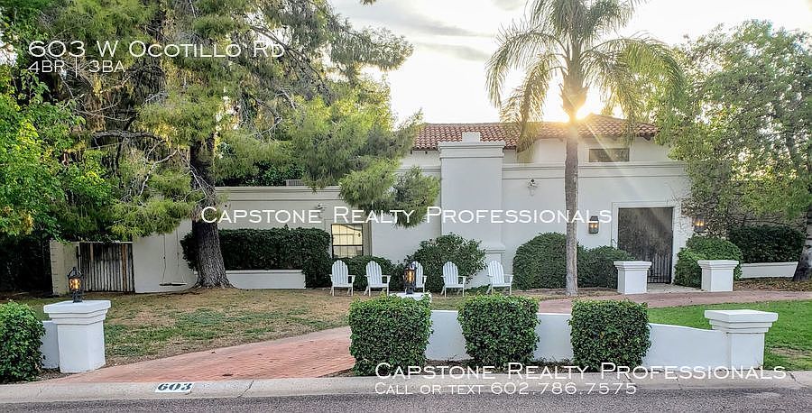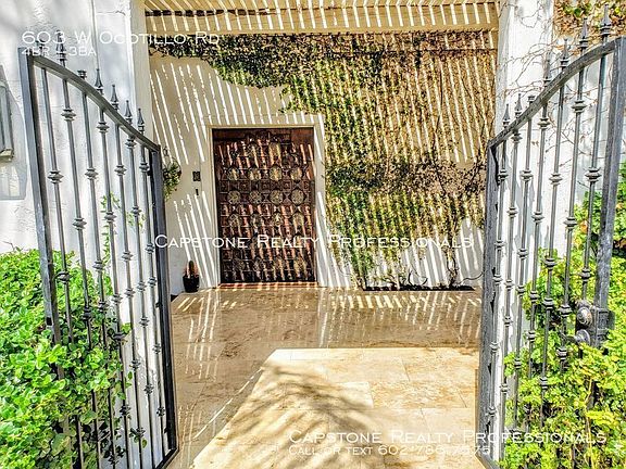 Welcome to Ocotillo House - rare opportunity to lease a one-of-kind luxury Mediterranean home in North Central Phoenix - tons of architectural details and design character, private tennis and basketball court, amazing 2-story custom kid's playhouse, 3 separate outdoor patios, 2 fireplaces, swimming pool, prime location, and large corner lot on private street are what sets this home apart. . . PLEASE NOTE: Photos not showing on Zillow for some reason right now : / See photos at Trulia.com until this bug is worked out - Thx Dave . . INSIDE Large 3,700 square foot, 4 bedroom, 3 bathroom home. 3 bedrooms located downstairs in south wing of home are spacious with hardwood floors, and ceiling fans. Fourth bedroom is a huge 800 square-foot (20 ft x 40 ft) master suite and makes up the entire upstairs floor with a fireplace, large bathroom, spacious walk-in closet, and vanity. . Large living room has fireplace, decked out with high-end trim, hardwood floors, and high ceilings with exposed beams. . Home has abundant natural light, but was expertly designed by architect for Arizona summers so that windows and french doors are shaded from direct sunlight throughout the day. Front door is a 19th century Moroccan hand-made door that will impress any visitor. . Bathrooms are modern, clean, and bright. 2-car garage with shelving and red brick driveway. . Kitchen has all the features and appliances including a very large walk-in pantry. Kitchen window over the sink looks out onto tennis and basketball court - which is great when family or friends are over for dinner and play. The library is open to the kitchen and makes a great gathering place for family or friends when preparing meals in the kitchen. . OUTSIDE Enjoy entertaining inside and out. Home is surrounded by spacious front yard and back yard, and 3 separate patios which provide over 700 additional square feet of outdoor living space with travertine flooring, lots of shade, exposed wood beams, and views of mature trees, vines, and nature. . Neighbors' homes are located far enough away to provide excellent privacy, views, and tranquility. . The private sports court has a tennis court, basketball with adjustable hoop and half-court striping, and pickleball (like ping pong on a tennis court - very fun!). Court is lighted for play after sunset. . The magical playhouse is a mini Cape Cod style home with 2 levels, dog house dormers, porch with porch light, plugs and lights inside, hardwood oak floors, and windows that open. . . LOCATION Prime location in the middle of the Phoenix-Metro area. Located in the North-Central Phoenix Neighborhood - a long-established neighborhood with lots of colorful plants, huge shade trees, and many green lawns, North Central Phoenix is distinctively "green" thanks to a special landscaping water system. Great sense of community and Phoenix culture that is difficult to describe, but can be experienced when touring this neighborhood compared to other affluent neighborhoods in the Valley. North Central Phoenix even has its own newspaper! . Close to light rail and less than half mile to the famous Murphy's bridleway path on Central Avenue and take a pit stop at the weekend farmer's market. Bike or Uber, 1-mile away is the Valley's hottest dining destination on 7th Street's restaurant row -- Over 2 dozen local independent restaurants and taverns, including Phoenix's highest-rated bar on Yelp: The Whining Pig - a great date night! . Home is on a small block with only 33 homes, large trees that canopy the street, and only one way in and out - means the streets are quiet and the only cars passing by are friendly neighbors that often wave as they drive by. Get to know them at the annual block party if you choose. . Within the boundaries of the Madison School District with the highest-ranked elementary and middle schools in Phoenix. 2-minute walk to Madison Meadows Middle School. Madison Simis Elementary School bus stop 75 feet from home - very convenient if riding! . Renter's agents welcome.