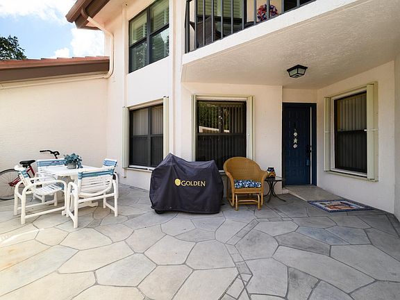 This updated two-bedroom, two-bathroom condo in Montego Cove, a 55-plus community, features a spacious courtyard patio and an enclosed porch with lake views. Inside, you'll find newer LVT flooring, an updated kitchen with granite countertops, and a generous living and dining area. The primary suite has walk-in closets, and there's storm protection with accordion hurricane shutters. Community amenities include two swimming pools, tennis and pickleball courts, and a clubhouse for social activities. Conveniently located near downtown Stuart, US-1 shopping, local beaches, and medical facilities.