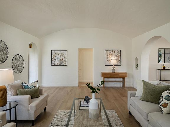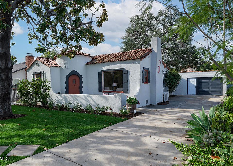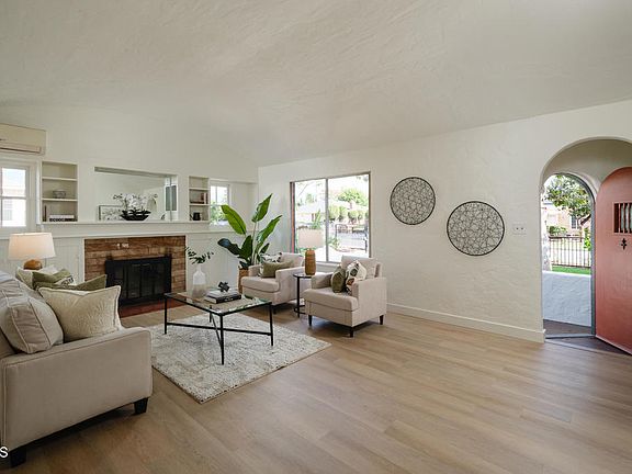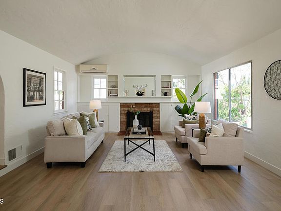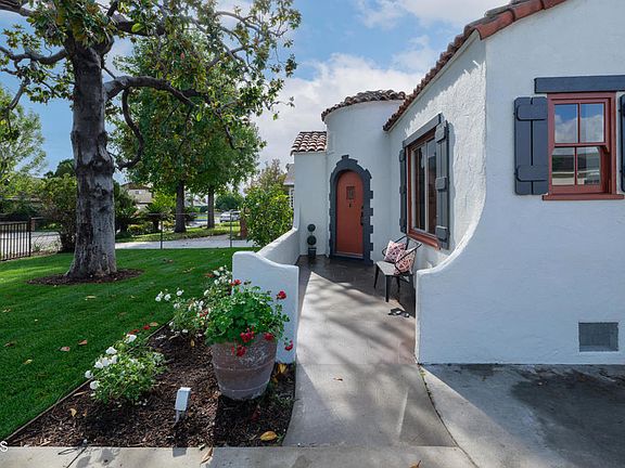 Nestled within a lovely Temple City neighborhood, this enchanting Spanish-style home blends timeless architecture with thoughtful updates. Behind a gated front yard framed by a graceful magnolia tree, a distinctive turret entry welcomes you through a custom rounded front door, setting the tone for the character and warmth found throughout. Inside, the living room showcases a dramatic barrel ceiling, built-in shelving surrounding the classic fireplace, and a ductless mini-split air conditioning system for year-round comfort. Double-hung windows invite soft natural light, highlighting the craftsmanship and charm that define this era. A graceful arched doorway leads to the formal dining area, ideal for gatherings, and continues into the kitchen, where modern touches meet classic design. Quartz countertops, LED lighting, and ample cabinetry provide both style and function. Off the kitchen is a cozy breakfast nook with built-in cabinets and an arched pass-through to the dining room, a perfect spot for morning coffee. Nearby, a utility and laundry room offers additional storage and backyard access. The home's two bedrooms each feature closets with the hallmark vintage windows so characteristic of early California homes. Between them sits a full bathroom with a tub and shower combination, a single-sink vanity with stone countertops, and period-inspired details that honor the home's heritage. Outside, the expansive backyard invites both relaxation and entertaining. A covered patio and outdoor fireplace create a welcoming space for gatherings beneath the shade of a majestic oak tree. The gated driveway and side porch add convenience and charm to this picture-perfect property. The detached garage has additional storage and a workbench area. Located just moments from the San Gabriel Country Club, local dining, and entertainment, this Spanish gem offers a rare opportunity to own a piece of Temple City character and history, where timeless architecture meets everyday comfort.