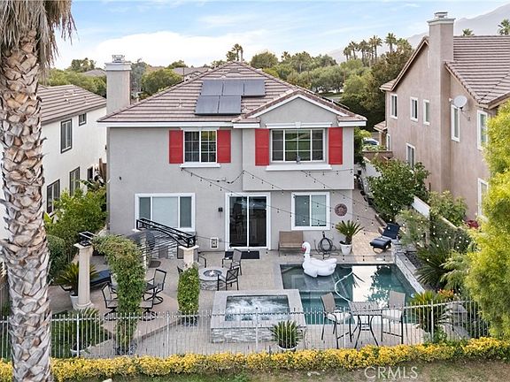 Welcome to this beautiful pool home in a premier community on the Sierra Lakes Golf Course! This stunning 4-bedroom, 3-bathroom home offers luxury and resort-style living. Located on the signature hole #6, which boasts a large water feature with a stunning fountain, and offering the most breathtaking view in the neighborhood, this property is a rare find for those seeking elegance. Step inside to discover a thoughtfully designed interior with custom crown molding and rich wood flooring throughout. The formal dining room, featuring a striking decorative stone wall and custom chandelier, is perfect for hosting dinner parties. A separate formal living room adds sophistication, while the cozy family room with a fireplace invites relaxation. Upstairs, a built-in desk provides a convenient workspace, and select furniture is included for a seamless move-in. The upgraded kitchen is a chef’s delight, boasting a double oven, walk-in pantry, custom lighting, and all appliances, including the refrigerator. The downstairs powder room impresses with a modern floating vanity, and the upstairs primary suite offers a serene retreat with custom ceiling fans for added comfort. The upstairs laundry room, complete with a sink, ample storage, washer, and dryer, makes chores a breeze. Outdoor living is where this home truly shines. The backyard is an entertainer’s paradise, featuring a built-in barbecue with refrigerator and sink, covered gazebo, fire pit, and a sparkling saltwater pool with waterfalls, controlled by a Pentair system via a phone app. Unwind in the jacuzzi or tend to the herb garden in the expansive side yard, dotted with grapefruit, orange, and lime trees. The beautifully landscaped grounds enhance the stunning views, making every day feel like a vacation. Practical features include a two-car garage with overhead storage, a solar system with battery backup, a Tesla 220V charging system, and a tankless water heater. The HVAC system is serviced annually for peace of mind, and new window screens add a fresh touch. Stay connected with a smart sprinkler system and secure with a Vivant security system, both app-controlled. Community amenities elevate the lifestyle, with a clubhouse just a two-minute walk away, offering Sunday brunch rated #2 in the Inland Empire. Golf enthusiasts will love the top-ranked Southern California golf course, a true golfer’s paradise.