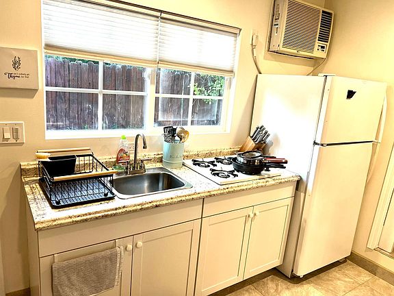 Charming 1BR guesthouse with a private entrance situated in a peaceful cul-de-sac near a school farm. Relax with your morning coffee while listening to the sounds of farm life cows mooing, pigs oinking, sheep bleating, and donkeys braying. This cozy guesthouse features a bedroom with a queen-sized bed, a living room equipped with a TV, couch, and coffee table, as well as a dining area with a table and four chairs. The kitchenette includes a microwave, toaster oven, air fryer, and cooktop, but does not have a conventional oven. You'll also find a shower and a washer/dryer in the unit. Step outside to enjoy the patio and outdoor furniture on sunny days. Located in a safe and tranquil area of Woodland Hills, a car is recommended for your stay. However, you can also take a leisurely 20-minute walk to the Village, Westfield Mall, and Fallbrook Mall. Owner pays Gas & Water. Tenant pays electricity.