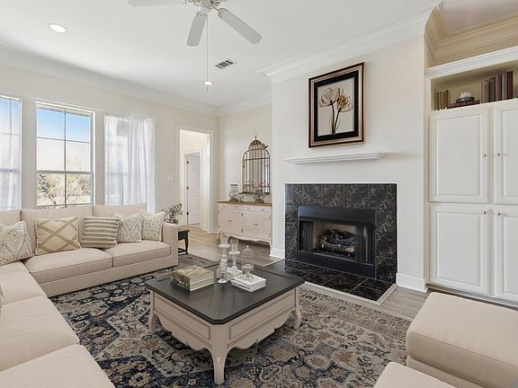 Charming Courtyard Home with Lake Views. Nestled in The Greens at Pelican Point, a sought-after 55+ active lifestyle community, is this 3-bedroom, 2-bath home. You'll enjoy the open floor plan concept with lake views from many rooms. The inviting living room features a fireplace with built-in cabinets, while the kitchen offers a gas cooktop, breakfast bar, and plenty of storage. The spacious dining room opens to a private courtyard, creating the perfect indoor/outdoor living space. Relax in the primary suite, complete with stunning lake views, a walk-in closet, and a bathroom featuring a double vanity, jetted tub, and separate shower. Outside enjoy the covered patio overlooking the water...a perfect retreat! Amenities include newly installed vinyl tile flooring in the main living area and carpet in the bedrooms, a metal fence and gate, and gutters around the entire home with leaf guards. Community amenities include recreation and fitness facilities hosting a variety of activities and an indoor pool. Pelican Point Golf Community adds golf, tennis and more to your lifestyle. Call today for your private showing of this incredible home.