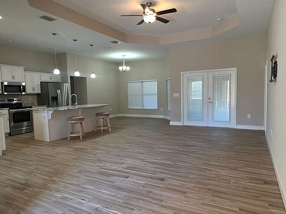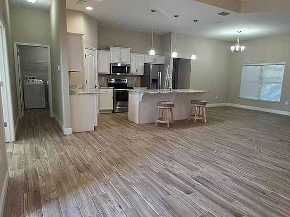 This home features elegant tile flooring throughout designed to resemble wood planks, offering a modern look with easy maintenance. The open, functional layout flows seamlessly to a spacious screened-in back patio, ideal for relaxing or entertaining.