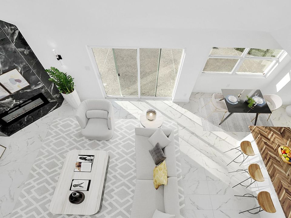 High ceilings, marble-look tile flooring, & a dramatic corner fireplace with a floor-to-ceiling accent wall add warmth & character. The gourmet kitchen shines with herringbone-patterned butcher block counters, custom cabinetry, high-end appliances, & a wine fridge—designed for both daily living and entertaining. Create your own space with versatile bedroom spaces Bathrooms showcase sleek finishes & touchscreen mirrors for modern elegance. The oversized lot provides ample space for outdoor living, complete with sparkling pool for year-round enjoyment.