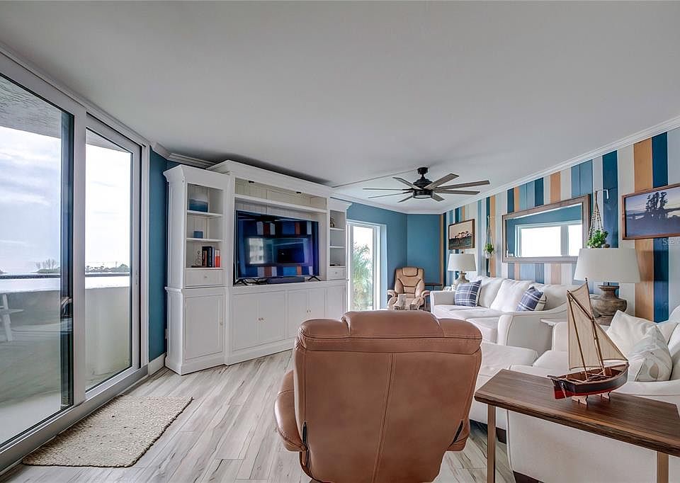 Welcome to this beautiful rare end corner two-bedroom, two-bath condo nestled in a gated and guarded community, offering breathtaking views of the Gulf of Mexico. This exceptional property is surrounded by water, creating a serene oasis where you can witness manatees and dolphins frolicking in the nearby lagoon. Condo also includes assigned parking space and stackable washer and dryer. Relax on your choice of one of THREE open air private balconies with your favorite beverage or meal enjoying your Nature's Paradise watching the dolphins swim, manatees float, birds soar by. The island community is surrounded by water except for the 24/7 guarded entry for your upmost security. It features a Gulf front heated swimming pool, Nature's trail, Private Sandy beach, waterside picnic area, tennis & pickleball courts, fishing, and kayak storage. Assigned boat slips in the community Marina become available to purchase or rent occasionally. The monthly maintenance fee includes all amenities, 24 hour guards, and all the utilities including cable and WIFI. Does not include electricity. Milestone Inspection is completed and building passed! Local waterfront restaurants and casual beach bars are easily accessible by boat or vehicle. Enjoy multiple area State Beaches and Parks, golf courses, shops, and the close by Sun West Water Park. Easy access to all that the Tampa Bay and the St Pete/Clearwater areas have to offer day or night. This community is one of the Best Waterfront values and Best kept secrets around. View the community tour to walk along the Nature's Trail and beach and fly over the community. Call today for Your Private in person viewing. **Community Features:** - Swimming heated pool for relaxation and exercise - Tennis courts and pickleball for sports enthusiasts - Private boat docks that can be rented from the Association **Condo Highlights:** - Open Great Room floor plan, perfect for entertaining - Spacious private (2) balconies accessible from both the Great Room and the Primary Bedroom, offering panoramic views of the Gulf, pool and the lagoon - Beautiful kitchen with granite countertops, stainless steel appliances, and ample cabinet and counter space - Large dining area and cozy living room with luxurious leather couches **Bedrooms and Bathrooms:** - Primary bedroom with private balcony access, allowing you to enjoy the stunning views right from your room - Primary bathroom features a gorgeous walk-in shower and double sinks for added convenience - Second bedroom with its own views and providing plenty of natural light and a connection to the outdoors - Second bathroom also boasts a spacious walk-in shower This condo is impeccably decorated, offering a comfortable and stylish retreat. Whether you're looking to spend the winter months in Florida or seeking a year-round residence, this property provides an idyllic setting to enjoy the best of coastal living.