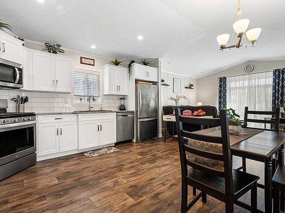 BEAUTIFUL home, shows 10/10! Greeted with a LARGE COVERED deck inviting you for all year entertaining. Inside, you will be invited by a stunning white kitchen w/ maple cabinetry, S/S appliances, GAS stove, NEW dishwasher, OVERSIZED w/d; BACKSPLASH, lam flooring, A/C, PHANTOM screen. The 2 bed, 1 full bath w/ SOAKER TUB is perfect for relaxing in; laundry rm is strategically located hidden in the bathrm. The vaulted ceiling creates a spacious & airy home; natural light coming in from all windows. A perfect place to call home while you never miss out on entertaining your guests w/ the OPEN CONCEPT. Outside, you have a SHED to store all your extra items. Small dog, no cats, landscaping done, affordable pad fee $550/month, beautiful 55+ park, furnace recently serviced.