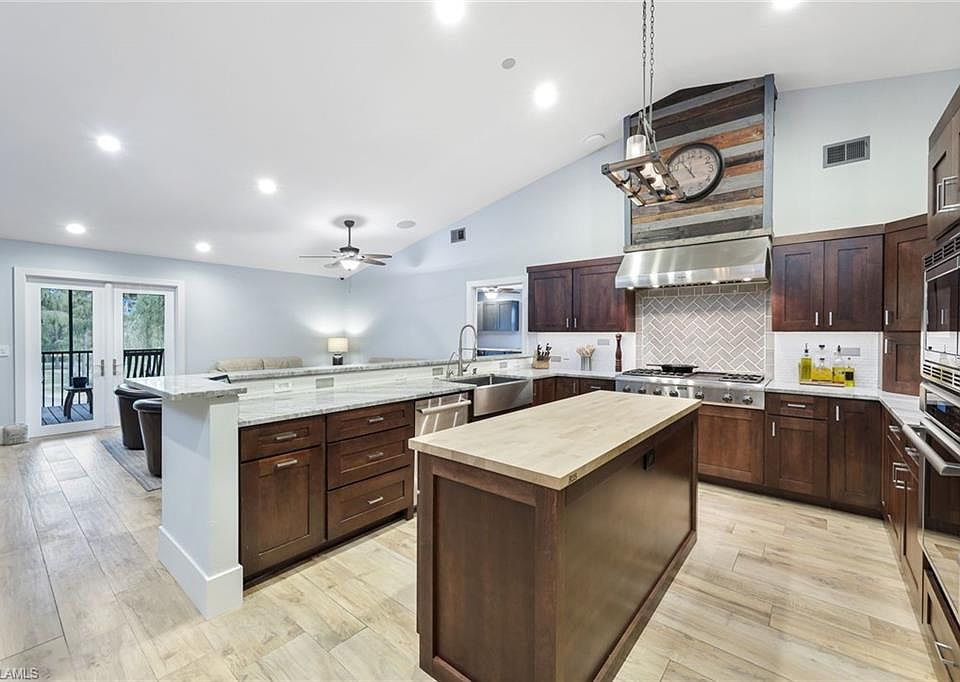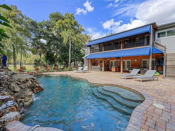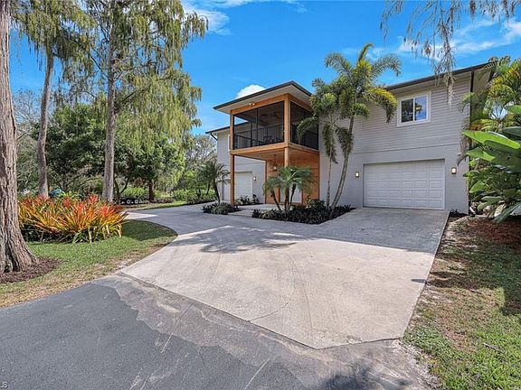 Motivated Seller! Embrace the Florida Lifestyle in this meticulously updated 4 bedroom, 3 bath, den, with custom pool and spa on a 2.5 acre lot with high and dry X flood Zone. Lush landscaping with Oaks, Cypress and Ficus trees compliment the long driveway that circles 2 garages and additional parking for 20+ cars. Home is equipped with smart home entertainment, control music, cameras, and lighting. 1st floor boasts a grand foyer, recreation room with full bath, wet bar, pool table, and wood-burning fireplace. French doors open to a covered outdoor living area with kitchen and bar. Custom pool and spa with a grotto waterfalls create a resort-like atmosphere. Ascending the custom-lighted staircase to the second floor. A gourmet kitchen steals the spotlight with Thermador kitchen appliances including a gas cooktop with griddle, and convection wall oven that create a chef's paradise. The living room is adorned with a custom accent wall and French doors that open to the front patio with a spectacular view of the front yard. The Master suite has his and her closets with built-ins, lighted makeup vanity with cabinets and a glass door to the patio. 3 large guest rooms and den/office are all about 13 x 15. Formal family dining room looks over a custom bar with black walnut wood floating shelves. Sliders open to the huge screened 2nd floor patio. All Hurricane Impact Windows and 15,000 watt Generator. RV 220v outlet. 10 x 12 shed. 2.5 Acre lot, X flood Zone. New gutters with Leaf Guard System in 2020. Just installed March 2024 New Whole House Reverse Osmosis System. 100lbs propane tank. Highly desired school zones Poinciana, Gulfview, Naples High School. Great location 15 minutes to shops, restaurants, walking and biking trails, beaches and everything Naples has to offer.