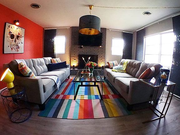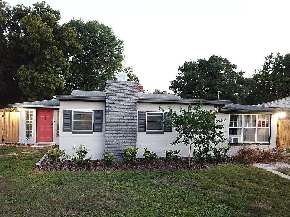 This nice Mid-Century Modern block home accented in brick offers a unique updated floor plan with plenty of extra space. The kitchen offers stainless steel appliances. The formal Living Room is accented with beautiful brick wood-burning Fireplace and is adjacent to the formal Dining Room. The oversized Foyer has two large Walk-in closets Relax in the screen-enclosed Lanai with ceiling fan and views of backyard, accessible through the rear bedroom French Doors. Open Patio next to Lanai perfect for outdoor grilling including lighting and exterior electrical outlets. Convenient indoor Laundry Room. Driveways on both sides of the home with one wrap-around offering sufficient space for large or multiple vehicles. The kitchen and bathrooms have recently been remodeled. The flooring has been replaced throughout the house and offer carpet in the rooms and laminate in the main areas.