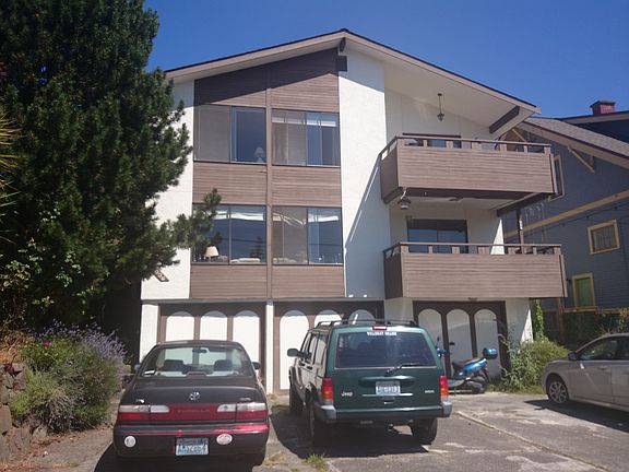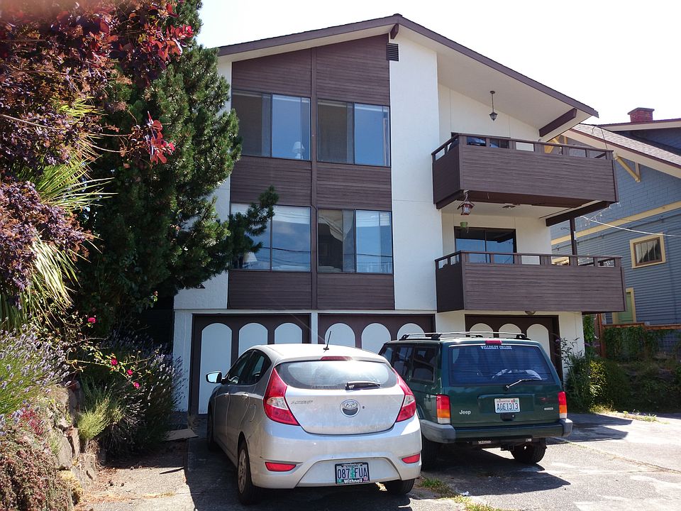 Two level apartments (flats) on 2nd and 3rd floor of building above a double and single garage. Both units have nearly identical floor plans and front decks. The upper unit has a 240 square. foot deck in the back. Monthly rent on each unit is $2,400/month for a total rent of $4,800/month. Vacancy rate near zero for ten years. Well landscaped. Large back yard garden.