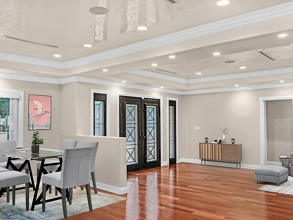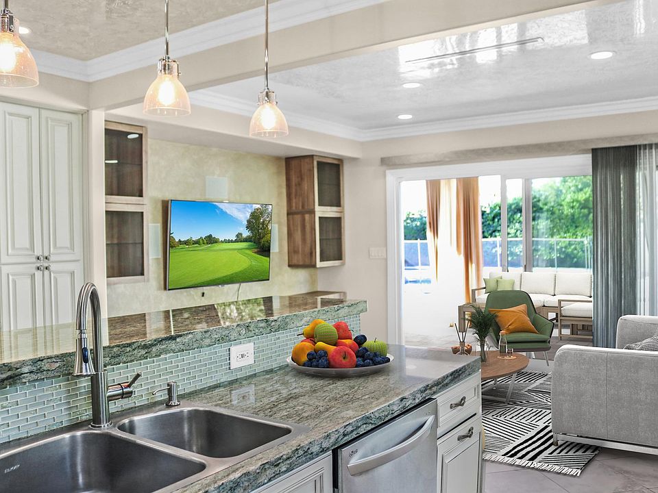 The bright, open floor plan includes a formal living room, dining area, and a peekaboo opening into the kitchen. High-end appliances and mounted TVs (as pictured) are ready for your use. Every detail from the plaster ceilings to the granite finishes adds to the home's sense of quality and style.