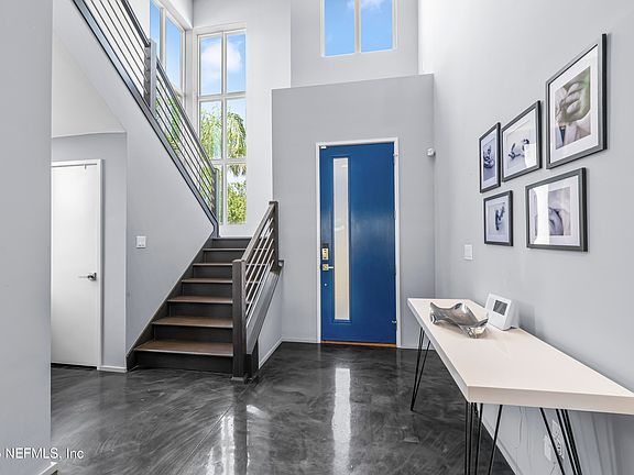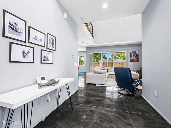 The main level features sleek polished concrete floors, while the second floor showcases warm hardwood flooring. The kitchen flows seamlessly into the spacious living area and extends outdoors to a large paver patio—perfect for entertaining or relaxing. Enjoy the built-in fire pit, grill, and outdoor refrigerator for year-round gatherings.