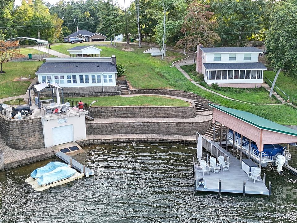 There are miles of main channel views from this 2 BR / 1 BA waterfront home on Lake Tillery. Recently remodeled with LVP flooring, tile shower, paint, updated kitchen with quartz counter tops. The living room offers a fireplace insert that is wood burning. The waterfront side is open to the lake with tons of glass for extraordinary views. There is one slip boathouse / dock and an inground boathouse with a fenced patio on top for entertaining and grilling out. The retaining walls offer a gentle slope and easy walk to the dock. Deep water at the boathouse as well. Concrete driveway and two detached carports. Only minutes away from Downtown Norwood for shopping, groceries and dining out. The City of Norwood owns the EF One sewer pump and is responsible for any maintenance or repairs that might arise in the future. Come find your Lake Tillery waterfront retreat at this property !!