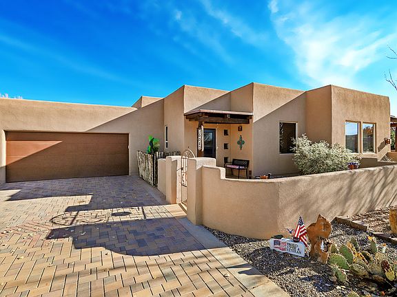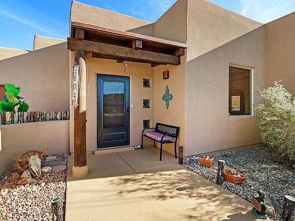 Discover the charm of this Contemporary Southwestern custom home in the gated Bosque del Rio Grande community. Nestled on a serene .27-acre lot, enjoy tranquil access to the Bosque and breathtaking Sandia Mountain views. This home has been lovingly maintained by original owner and features a stunning viga ceiling, a cozy gas Kiva fireplace, and elegant granite counters. The home offers three bedrooms, including one with a Murphy bed. The front bench, bar chairs, and back patio table set are all included. Plus, benefit from the 8 solar panels, tankless water heater, Nuvo whole house water softener system and recent roof update with silicone coating. Thank you for considering this beautiful home!