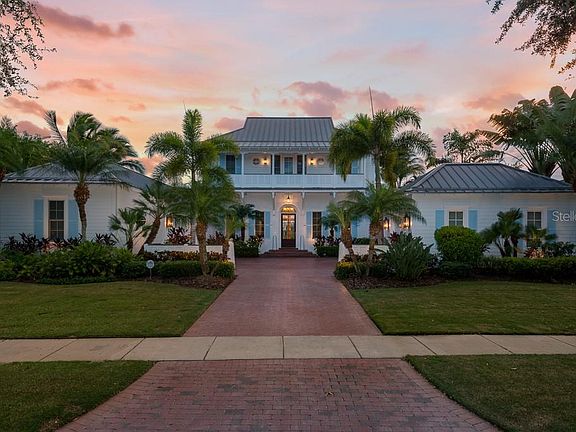 Why not live every day like you're on vacation? This West Indies inspired design by Cooper Johnson Smith, and built by Bayfair was featured in Coastal Living Magazine as the 2004 Coastal Living Idea House. Upon entry, you are immediately captivated by water views as well as the remarkable living room showcasing tongue & groove ceilings with stunning wooden beams. The remastered kitchen features an oversized island, new granite and shiplap leading into the family room where the feeling of indoor-outdoor living begins. Host events from the screened in porch with an outdoor kitchen and offer visitors the private guest bungalow with bed/bath. Enjoy days at the pool in a tropical oasis created by lush landscaping and watch sunsets each night from your lanai. You will rest easy in the lower level master with private patio spa, walk-in dressing closet and en-suite bath with soaking tub and wrap-around walk-in shower. Upstairs you will find a flex space, two bathrooms, and three ample sized bedrooms each with entry to a large waterfront balcony offering panoramic views of the lagoon. This unique home spares absolutely no attention to detail and is truly one of a kind. Come live the ultimate Florida lifestyle at this masterpiece within the gated community of Mirabay!