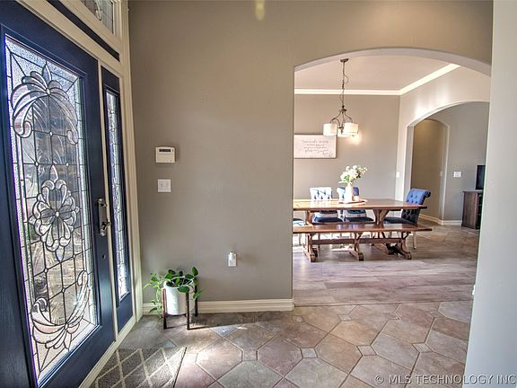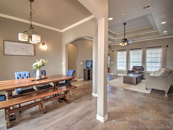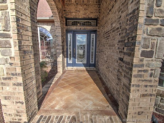 Luxurious Brick and Stone Home with Custom Features and Stunning Accents. This home boasts many custom features and exquisite accents that are sure to impress. From the copper accents on the roof to the scored and stained concrete driveway and front porch, every detail has been carefully crafted to create a truly spectacular home. As you step inside, you'll be greeted by a grand entry door with a transom above and arched doorways that lead to high ceilings throughout the home. The formal dining room is bathed in natural light and features wall sconce lighting that adds a touch of elegance to every meal. The open living room is the perfect place to relax and entertain guests, with a tray ceiling and huge windows that provide plenty of natural light. The kitchen is a chef's dream, with custom cabinets, granite countertops, and a bar space, plus a breakfast area with a charming window seat. Plenty of storage space is available with a section of lower cabinet drawers, a plate rack above, and some decorative glass doors. The master bedroom is a true retreat, featuring a series of arched windows that look out over the backyard, as well as a door that leads directly to the patio. The master bath is equally luxurious, with a large tile shower with frameless glass enclosure, double sinks, a dressing table, and a walk-in closet with a pocket door. Two additional bedrooms and a bath are located on the opposite side of the home, offering a split plan for added privacy. The second bath features a deep tub with a cool tile and glass block surround. Near the front door, you'll find an additional room with a bay window that would make a beautiful, sunny office or a guest room. The home also features a huge laundry room with a cabinet and sink, as well as hanging space for coats and additional storage. The back yard features a covered patio and a big expanse of scored and stained concrete for outdoor entertaining. The yard is completely enclosed with a privacy fence.