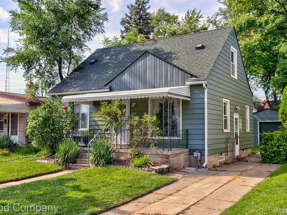 Lovely Hazel Park bungalow features a large eat-in kitchen, private primary bedroom, and finished basement. Covered front porch entry to a bright living room with hardwood floors. Large kitchen with tile backsplash and open shelving. Two nice sized bedrooms share a full bath down the hallway. Large primary bedroom on the upper level with hardwood floors. Finished basement with a second full bath, laundry, and storage space. Private backyard with a detached garage, fire pit, pergola, and storage shed. New furnace 2022 and water tank 2018. Walking distance to local parks and easy freeway access. Welcome Home!
