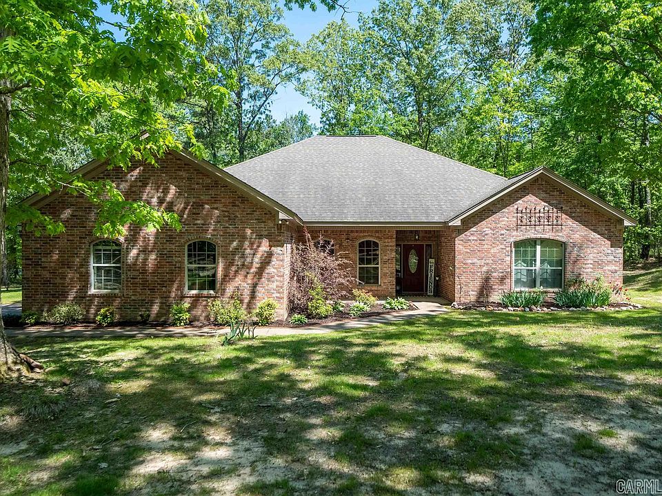 Peaceful wooded acreage with easy access to I-30 is the setting for this 4 bedroom, 2 bath brick home. The covered back porch spans the length of the house overlooking the stocked pond and back acreage for outdoor enjoyment in any weather. The large master bedroom has an ensuite bathroom and access to the back porch. Plus, the huge walk-in closet is reinforced as a storm shelter! A wood stove fireplace can keep you cozy when winter rolls back around. Until then, the shaded property is the perfect setting for southern summers. The kitchen has a gas stove and gorgeous granite countertops that are as durable as they are beautiful. Dedicated pantry and large laundry room with oversized sink are accessed directly from the 2 car garage. Come enjoy country style living with quick access to shopping and the interstate.