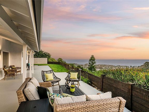 Perched on a quiet, single-loaded street in the hills of San Clemente, this single-level home delivers everything you want from a coastal property—unmatched ocean views, privacy, and thoughtful upgrades throughout. Set on a private corner lot with no neighbors looking in, the home enjoys exceptional seclusion and a deep, wide backyard that’s rarely found in view homes. The property spans approximately 2,124 square feet with three bedrooms and two bathrooms, plus a large bonus room on the opposite side of the garage. Outfitted with its own mini split system, this flexible space is perfect as a guest suite, game room, or home office. Inside, the open-concept floor plan creates effortless flow between the living, dining, and kitchen areas. A wide family room anchors the space with a gas and wood-burning fireplace, warm oak flooring, and oversized windows framing the backyard and Pacific beyond. The kitchen has been tastefully updated with flat-panel European-style cabinetry, quartz countertops, a peninsula for extra prep space, and high-end appliances including a six-burner gas range and double oven. From the kitchen sink, you can take in an expansive, unobstructed view that stretches across Seal Rock and Catalina Island. Both bathrooms carry a modern, spa-like design with quartz counters, porcelain tile floors, and frameless glass showers. The primary suite offers ocean glimpses, generous closet space, and a calming atmosphere that matches the rest of the home. Recent system upgrades bring peace of mind and long-term value: a new roof, new air conditioning system, new 200-amp electrical panel, and a structurally reinforced foundation with 27 piers (engineered and permitted through the city) to ensure lasting stability. The property’s exterior has been completely refreshed, from smooth stucco walls to newly designed landscaping by a prominent local designer. Mature pines, low-maintenance plantings, and smooth concrete flatwork create a serene and sophisticated curb appeal. Beyond its visual appeal, this home stands out for its lot orientation and everyday livability. The single-loaded street means no homes directly across, and the corner placement allows for a greater sense of openness and privacy in every direction. Move-in ready and thoughtfully modernized, this property blends classic mid-century design with current-day comfort. Whether you’re entertaining, working from home, or simply watching the sun set, this San Clemente home truly has it all.