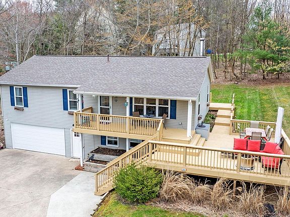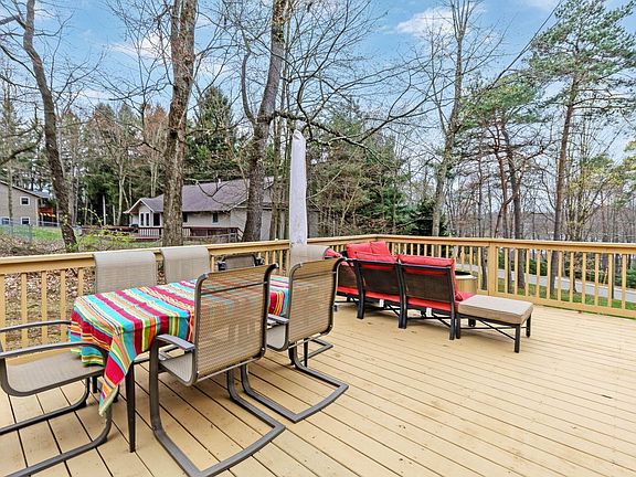 Enjoy Seasonal Lakeview's and start living your lake dream! This cute lake house sits back from the road and offers privacy and quietness. With the 2 adjoining lots, the home sits on a little more than ½ acre. With 3 bedrooms, a bunk room and 3 full baths, this would be a super, permanent home, or get-away place, to relax and enjoy the laid-back lake lifestyle. You'll love the amazing wrap around deck, that provides additional entertaining space, lake views and lovely sunsets. The main floor offers a semi-open concept with a functional layout. The living room's focal point is the awesome woodburning fireplace. The eat-in- kitchen, with SS appliance, and dining area have easy access to the large back deck, where the grilling and lake fun starts. The main level features a primary suite, two additional bedrooms, full bath and convenient laundry. The lower level, walk-out, has a great rec/family room, bunk room and beautiful full bath. There is a small storage area and a big 2 car garage. There is and enough concrete to have a basketball hoop, near the house. This move in ready home is within walking distance to King Beach, with a common walk area, from King Beach Drive to the lake. There are so many updates in this home, please, make sure to look at the Owner's Home Info document. The home is being sold furnished with a few staging items not included. 'Imagine getting an interest rate that is 1% lower than the current market rate. You can with this home!' Apple Valley Lake is a private community featuring a 511 -acre lake with 3 beaches, full-service marina, indoor/outdoor pools, clubhouse, & fitness center. & jet skiing allowed. 1 power watercraft per lot so this home allows 2 power watercrafts, a huge plus! Apple Valley golf course is a beautiful public course.