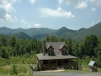 New cabin community with panoramic mountain views! Near Hiawassee, GA. Upscale rustic home with wood interior and lots of stonework inside and out. Granite kitchen counter tops, stainless steel appliances, hardwood and tile floors. Basement stubbed for additional bath. Convenient neighborhood with easy access. Wrap around porch on four sides!!