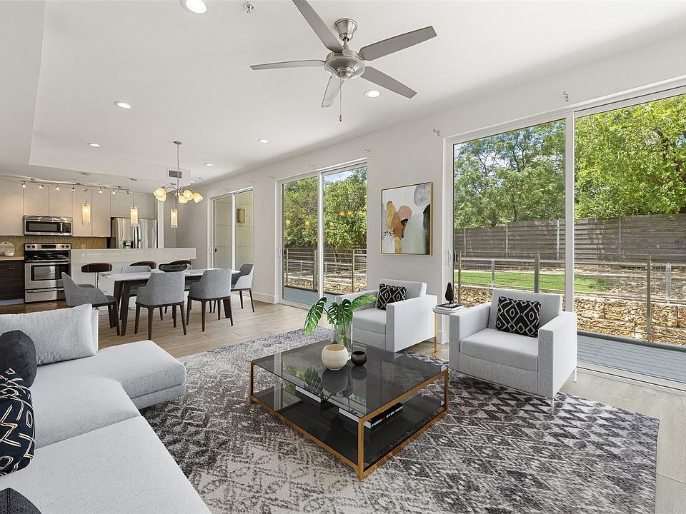 Modern, low-maintenance living in the heart of South Austin’s gated Skybridge Lofts community. This stylish three-level condo offers a bright, open layout with clean lines, contemporary finishes, and a flexible floor plan that maximizes space and privacy. One of only two units in the entire community with an oversized wraparound balcony, it offers rare outdoor living space that overlooks peaceful green space—perfect for relaxing or entertaining. The main living area features vinyl flooring, recessed lighting, and large windows that flood the space with natural light. A sleek kitchen includes an electric cooktop, stainless steel appliances, and ample cabinetry for storage. Three spacious bedrooms are positioned across multiple levels for optimal separation, and the upper-floor laundry adds convenience. The attached two-car garage provides direct access to the unit, and the community amenities—pool, fitness center, dog park, walking trails, and more—support an active lifestyle. Centrally located near South Congress, St. Elmo District, and with quick access to I-35 and Ben White, you’re never far from Austin’s best dining, shopping, and entertainment. A great opportunity for investors or owner-occupants seeking lock-and-leave convenience in a vibrant, growing corridor.