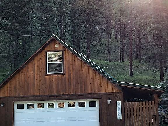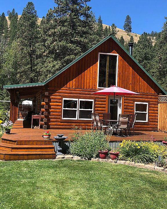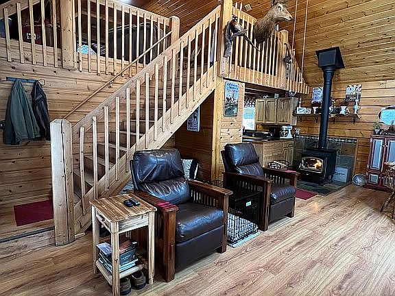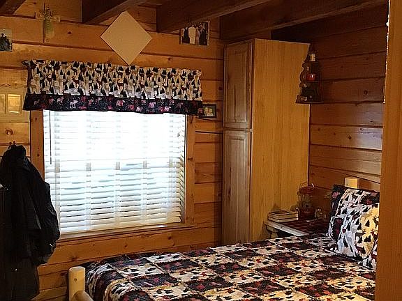 Great log cabin with vaulted ceilings and attached two car garage. One bedroom on main floor and upstairs office is currently used as the second bedroom. Private deck out back. Private 2 connection well. Outbuildings and garden area. Lot size is approx. 66’ wide by 174’ deep.
