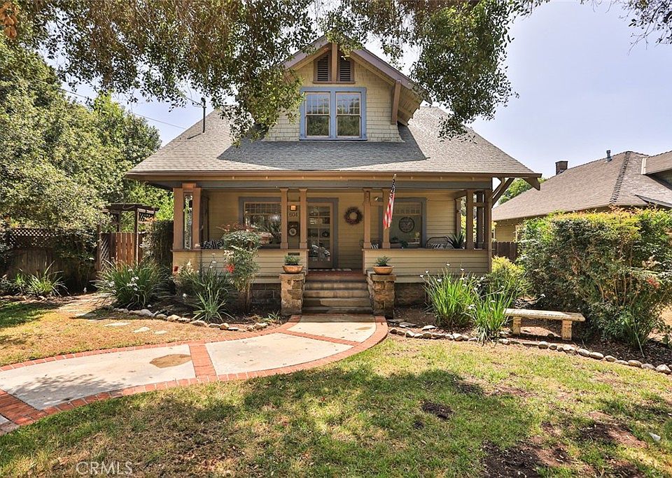 Welcome to this quintessential 1909 San Dimas craftsman home, a blend of historical elegance & modern conveniences. The charm begins at the inviting front porch, perfect for unwinding & admiring the manicured front yard. Inside, original hardwood floors flow through the living, dining, and family rooms, exuding timeless sophistication. The living room, adorned with picture rails and a gold Capiz light fixture, adds a touch of vintage glamour. Architectural beauty shines with room-dividing colonnades featuring built-in shelves, creating a harmonious transition to the dining room, which showcases board and batten wall millwork, a built-in window seat, a hutch, & a Capiz teardrop chandelier. The spacious kitchen blends form and function with granite countertops, a Viking range, and stainless-steel appliances. Convenience is key with a downstairs bedroom and full bathroom, ideal for guests or multi-generational living. Upstairs, the large primary suite serves as a serene retreat, complete with ample space for relaxation. An additional bedroom and a charming kids' play loft provide versatile living options. The upstairs bathroom, featuring a classic clawfoot tub, offers a luxurious sanctuary for unwinding. Outside, the nearly half-acre backyard is a verdant paradise with a large deck, ideal for alfresco dining & entertaining. The family room's French doors open to this outdoor oasis, creating a seamless blend of indoor/outdoor living. The garden is dotted with fruit trees, including fig, apricot, orange, lemon, lime, and apple, allowing you to enjoy fresh, homegrown produce. Functional spaces abound, with a large workshop attached to the garage & a separate craftsman shed providing ample room for hobbies and projects. The property also offers potential for a 2/1 ADU, adding even more versatility. The prime location close to downtown shopping & restaurants ensures convenience without sacrificing tranquility. As a property under the Mills Act, it represents a significant piece of history and offers property tax benefits up to a 50% rebate, making it as practical as it is beautiful. This San Dimas craftsman home is truly a rare find, blending historic charm with modern amenities, making it ideal for those who appreciate timeless architecture, luxurious comfort, & a serene, bountiful living environment. Whether seeking a serene family residence or a historically significant property with modern comforts, this San Dimas craftsman home will exceed your expectations!