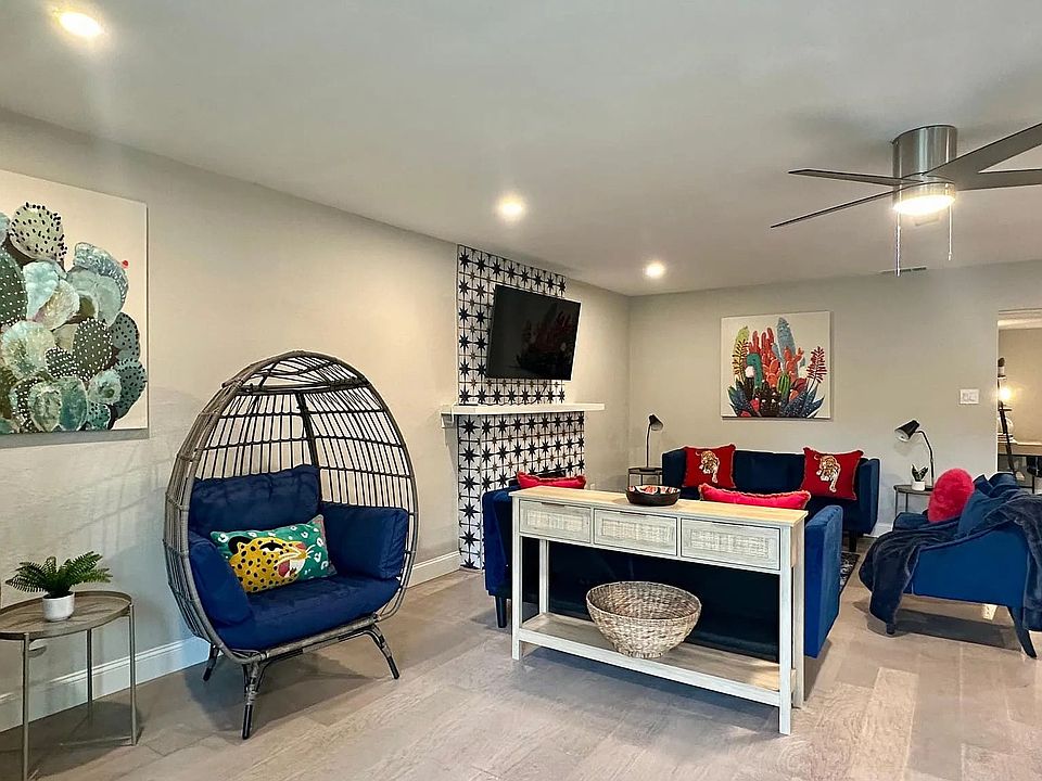 Features a bright open floor plan, modern kitchen with granite countertops, and a cozy backyard perfect for relaxing or entertaining. The house has 4 bedrooms and 2 bathrooms in total.