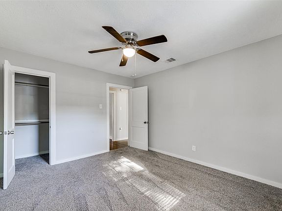Cozy carpetDark hardwood floorsPlush green grassFenced backyardGrey countertopsMature treesWhite cabinets