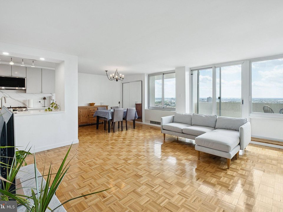 Beautifully updated two bedroom with a private balcony boasting see-forever southern city views on a high floor of Hopkinson House. This sun-soaked residence boasts fully upgraded kitchen and bathrooms, spectacular views spanning all the way from the Delaware River over southern Philadelphia to Center City, and parquet wood floors throughout. Enter into a welcoming foyer with a large coat closet and adjacent walk-in closet with dryer and additional storage space. Past the foyer is the bright and airy great room with a wall of south-facing windows, open living room, separate open dining space with wall closet, and sleek contemporary kitchen. The living room enjoys access to the private balcony, perfect for enjoying a morning cup of coffee and watching the sunrise over the river. The modern kitchen features flat panel cabinetry, quartz countertops and backsplash, stainless steel sink with garbage disposal, large island with waterfall countertop, tile floor, Bosch washer, and LG stainless steel appliances. The spacious primary bedroom boasts sunset views over the city skyline, excellent closet space, and an updated ensuite half bathroom with modern vanity and upgraded tile floor. The generously sized second bedroom has large windows with views of southern Philly and the skyline, as well as excellent closet space. Both bedrooms enjoy use of a full hall bathroom with modern white vanity, tub shower, and designer tilework throughout. There is upgraded lighting and excellent storage space throughout. Residents of Hopkinson House enjoy a 24-hour doorman and on-site management. There is a seasonal rooftop pool with see-forever city views and valet parking in the building for an additional fee, subject to availability. Hopkinson House is in close proximity to many of the city's historic and cultural sites, some of the city's best shopping and dining and provides easy access to the Broad Street and Market Street office corridors, as well as 676, 95, Amtrak's 30th Street Station and the Philadelphia International Airport.