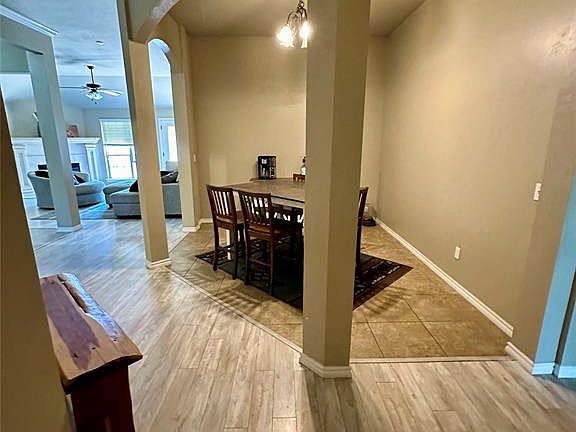 Beautiful home in a great location! Convenient access to I-35 and Tinker AFB, and just minutes away from Norman and the shopping and dining options on 19th Street in Moore. This home is nestled inside the desirable Apples neighborhood which provides a community park, splash pad, and ponds with sidewalks surrounding. This floor plan begins with a very open entry that leads you to a beautiful dining area, that is also partially open to the living area and kitchen. The large living room features a corner fireplace and vaulted ceilings. The living room is open to the kitchen which is full of beautiful wooden cabinets, a walk-in pantry, and spacious granite countertops that feature a convenient breakfast bar. The refrigerator will be staying with the home. The modern wood style flooring carries through the entry, living room, and hallway, with tile in the kitchen and dining. The large utility room has several cabinets, counter space, a storage closet, and hanging space. All bedrooms feature walk in closets, along with additional storage in the hallway. The master suite sits privately down the hall from the other two bedrooms and is very spacious along with its on-suite bathroom featuring a double sink vanity, separate shower and bathtub, extra storage cabinets, as well as a very large walk-in closet with shelving. The garage is extremely oversized for a 2 car garage for all of your storage or project needs, and is home to an in-ground storm shelter for your peace of mind. The backyard features a full surround wooden privacy fence as well as an extended patio with plenty of room to relax and enjoy the outdoors.. Don't miss out on this one, schedule your private showing today!