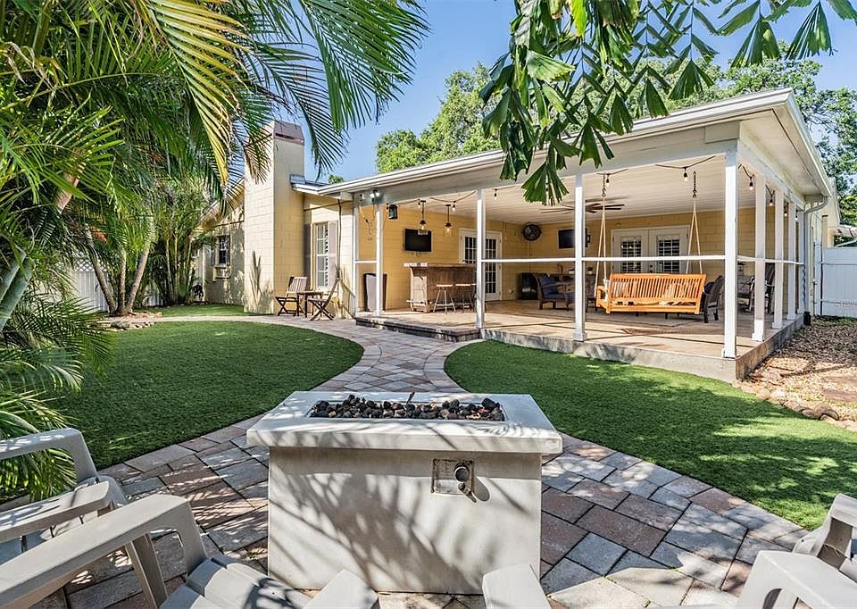 This move-in-ready home is a rare find, as it has never experienced flooding. Spanning just under 1,800 square feet, it offers ample space for large gatherings and entertaining. The home features a bright and airy living room, a separate family room with a newly resurfaced stone wood-burning fireplace, and a chef's kitchen equipped with solid wood cabinetry, stone countertops, a breakfast bar, and stainless steel gas appliances. Additionally, there is a separate dining room, enhancing the home's generous layout. The three spacious bedrooms provide a relaxing retreat, each offering plenty of room to breathe. Notable upgrades include fresh interior paint, new crown molding, and beautiful flooring. Enjoy Florida’s outdoor lifestyle with a sprawling 400 sq ft covered patio accessible from both the living room and master bedroom. And THAT backyard!!! The yard has been enhanced with $15k in upgrades, including maintenance-free turf, pavers, a sprinkler system installed in 2023, and lush landscaping. The property is equipped with a sturdy 2019 roof with gutters, providing peace of mind during the rainy season. Zoned for Shore Acres Elementary, an A-rated school, this home is the perfect blend of practicality and beauty. BONUS: The current owner's flood insurance policy is transferable with the sale of the property, adding an extra layer of convenience for the new owner.