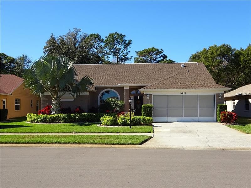 Spacious 2 bedroom, 2 bath home in the main gate section of Timber Greens. This light bright home has new roof 2016 with warranty. AC was replaced in March 2015. Living room/dining room with bamboo flooring. The kitchen features eating space at the counter, granite counter top and room for a dining table. Kitchen and family room combo make great for entertaining. Split bedroom plan with a pocket door separating the guest bedroom and bath private. Security system. Spacious master bedroom features walk in closet, second closet and sliders to the lanai. The master bedroom features, garden tub, separate shower and double sinks with marble counter top. Spacious laundry room. Tankless water heater. The lanai has plexiglass windows with hurricane shutters. Screen on garage door. The main gate area of Timber Greens has 24 hour manned security. Timber Greens is an active 55+ community with an 18 hole championship golf course providing women's and men's golf leagues. There is a restaurant and bar, tennis courts, huge resort style pool and spa, fitness center, arts and craft room, library, bocce ball, bowling league, card socials, bingo, women's club, water aerobics and yoga are some of the activities offered. Community is also adjacent to 8,000 acre Starkey Wilderness Park with recreation activities and biking trail.