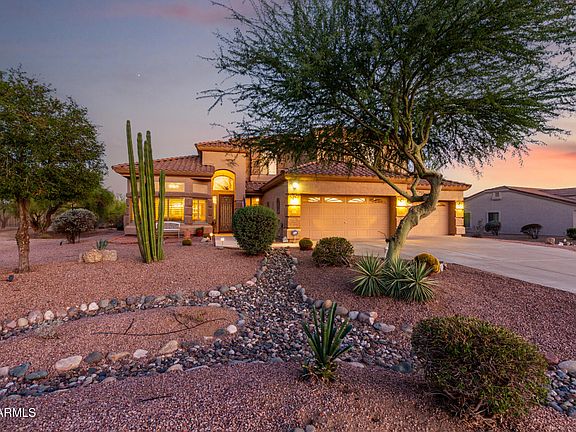Your dream home is finally within reach! This gorgeous estate features a 4-car garage, a picturesque desert landscape, and a front patio that sets an inviting atmosphere. Discover a stunning living room with soaring ceilings, abundant natural light, classic plantation shutters, and eye-catching wood-look flooring. You'll also find a spacious family room, perfect for spending memorable moments with loved ones. The exquisite chef's kitchen boasts chic pendant lighting, beautiful quartz counters, crisp white cabinetry with crown moulding, a tile backsplash, stainless steel appliances, a walk-in pantry, and an island with a breakfast bar. Double doors lead to the luxurious primary bedroom, showcasing soft carpeting, a cozy sitting nook, a lavish ensuite with double vanities, and a walk-in closet. You'll be delighted by the large home theater, offering a relaxing space for watching movies at home. Enjoy breathtaking sunsets in the lovely backyard, which includes a full-length covered patio, a built-in BBQ for weekend grills, and a refreshing pool for cooling down on hot days. Make this gem yours now!