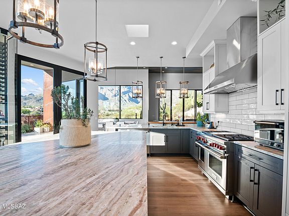 Established in Tucson's premier Catalina Foothills, this extraordinary contemporary residence embodies the very best of craftsmanship, custom finishings and refined desert living. The expansive picture windows fill the open living spaces with natural light, seamlessly blending the indoor and outdoor 360 panoramic views. The gourmet kitchen features stunning marble countertops, a large center island, and top-of-the-line stainless steel appliances. The serene primary suite includes a fireplace and spa-inspired bath area paired with stunning mountain views. Entertain and accommodate guests with the pre-installed Sonos sound system, smart heated pool and spa with automated safety cover, firepit lounge, and extended 3-car garage. Located near premier shopping, dining, and entertainment.