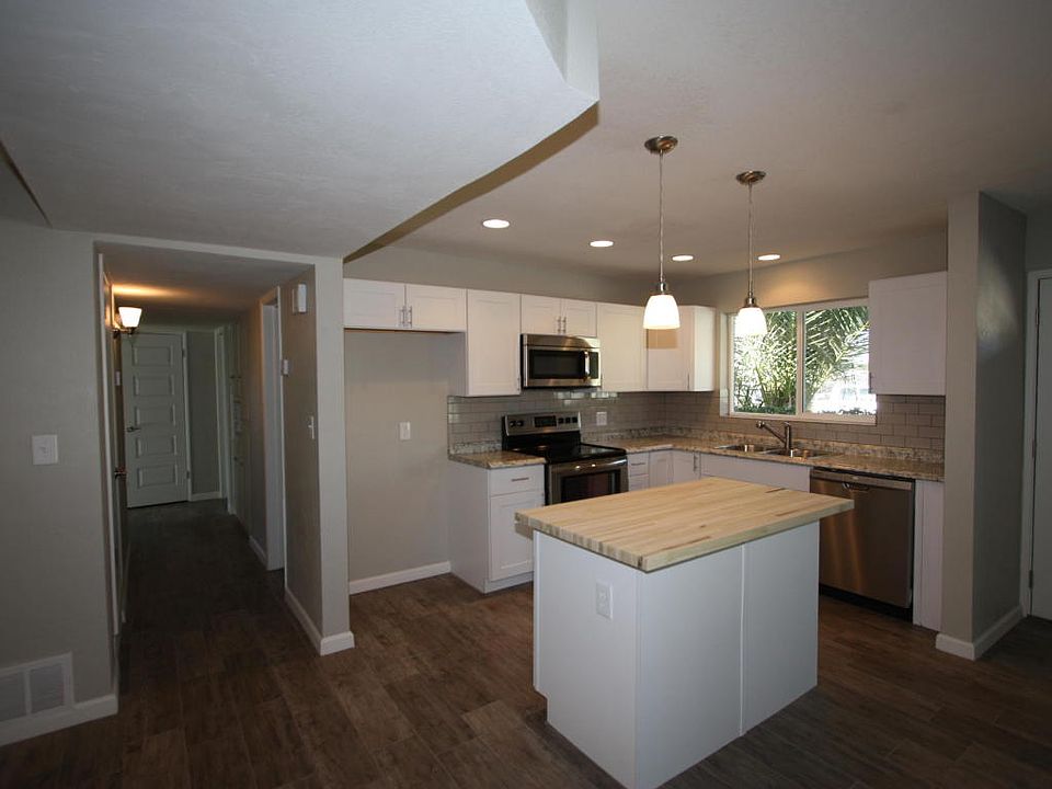 new tile flooring, carpet, lighting, kitchen counter tops and cabinets, bathroom counter tops and cabinets, 2 tone interior paint, tile shower surrounds, windows, stainless steel kitchen appliances and exterior paint.