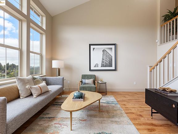 This light-filled corner unit is perched in the beautiful Monte Vista Villas community in the Oakland Hills, offering sweeping, unobstructed Bay views. With three spacious bedrooms and three full bathrooms, this tri-level townhome features an open-concept living area with soaring ceilings, recessed lighting, and warm-toned cabinetry that complements the modern finishes throughout. The top-level primary suite includes a walk-in closet, dual vanity, separate soaking tub, and serene natural light. Downstairs offers a full bedroom and bathroom ideal for guests or a home office. Additional features include a private patio, tandem two-car garage, and ample in-unit storage. Monte Vista Villas offers multiple playgrounds, a gym, and a clubhouse, all surrounded by hillside trails and scenic overlooks. Just minutes to BART, OAK airport, regional parks, and the Oakland Zoo. Don’t miss this peaceful yet connected lifestyle in one of Oakland’s most inviting communities.