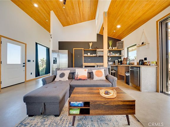 Custom-built in 2023, this stunning Upper Friendly Hills home offers sweeping views of Joshua Tree with soaring 12–16’ ceilings and walls of Milgard picture windows and French doors that bring the outdoors in. The open layout features polished concrete floors, tongue-and-groove cedar ceilings, and butcher block counters for a warm, organic feel. The kitchen comes with new stainless appliances, while the spa-style bath includes a custom double vanity with Indonesian stone sinks, a floor-to-ceiling tiled shower, and steam sauna. Resort-style outdoor living includes a custom 9-hole putting green and a massive 19’ long swim spa, perfect for entertaining, recreation, and stargazing. With fully paid solar, energy-efficient 6’ walls, and stylish furnishings included, this home is move-in ready. Located minutes from the National Park entrance, downtown Joshua Tree, and Pappy & Harriet’s, this is the ideal desert retreat or full-time residence.