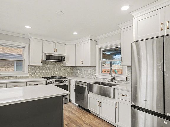 Welcome home! This brick ranch has been fully updated & offers a second story addition for extra comfort! Featuring a two-story addition with real hardwood throughout, this home provides the perfect blend of space and flexibility. With a primary suite upstairs, and multiple first floor bedrooms, this home checks all the boxes. Enjoy the bright kitchen with new oversized cabinets, high-tier island, and 2025 appliances. The driveway leads to a spacious 2.5-car garage (25x23), featuring two overhead doors, and tons of storage space. Located just down the street from the train station and tons of local options, come check this home out today!