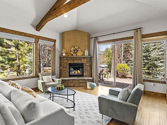 This coveted single-level SW Bend home features an open floor plan, large outdoor living space, and a spectacular setting nestled in the gated Points West community set against the forest, with miles of trails steps from the front door. It offers 3 bedrooms, including a primary suite, jr. suite, a spacious vaulted great room with wood beams and gas fireplace, and a modern office suite with built-ins that accommodate two people. Enjoy entertaining from the large kitchen island, outdoor patio and firepit, the relaxing sounds of the water feature, and connecting with friends in a community known for its neighborliness. Very private neighborhood- no one drives through except residents! The HOA manages gate security, exterior home maintenance, landscaping, snow removal, water features, and more, which makes Points West an easy-living neighborhood, giving you more time to enjoy the Bend lifestyl