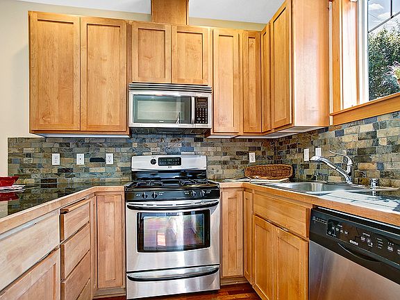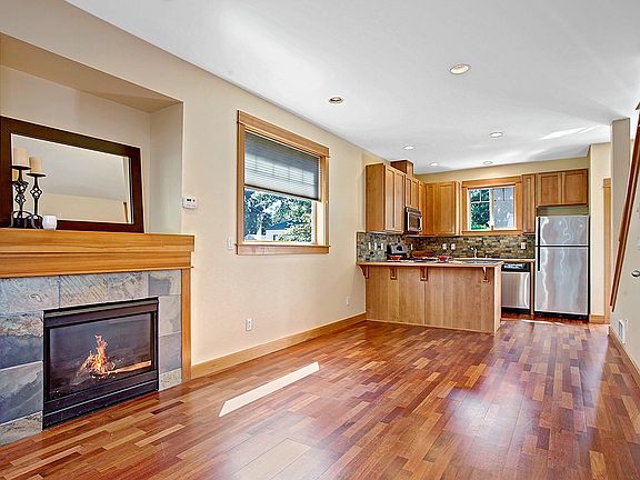 Great condo alternative in fabulous West Seattle.No homeowner dues!Newer townhome w/fine finishes&mill-work.Main floor:gleaming hdwds,9'ceiling,gas frpl,1/2 bth,granite counters,cherry cabinets&ss app,cozy,sunny,fully fenced patio.Upstairs:2 spacious bdms,laundry rm,with washer &dryer,a newly remodeled bath w/travertine floor& handsome tiled tub surround.2 off-street parking spots. Excellent location,just blocks from California Ave shops & restaurants. 23 minutes express bus to Pioneer Square!