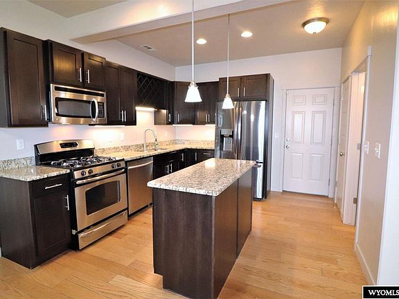 Discover this modern townhouse that blends style, comfort, and affordability! Enjoy low-maintenance living with a thoughtful design and spacious layout. Step inside to soaring 9-ft ceilings and an open-concept living and dining area. Rich wood flooring flows throughout the main level, adding warmth and elegance. The kitchen is a true showstopper, featuring dark cherry cabinets, sleek granite countertops, a versatile island illuminated by pendant lighting, a built-in wine rack, pantry, and stainless-steel appliances. The dining area shines under a charming chandelier, while the expansive living room is filled with natural light from tall windows. A convenient half-bathroom completes the main floor. Upstairs, all three bedrooms offer comfort and privacy. The impressive primary suite includes a cozy alcove—perfect for a reading nook or sitting area—a spacious walk-in closet, and an en-suite bath with generous counter space and a sleek walk-in shower. A dedicated laundry room with shelving adds practicality, while the versatile loft area at the top of the stairs makes an ideal home office or study space. Outside, enjoy a beautifully landscaped front yard maintained by the HOA, complete with a lush lawn, shrubs, and sprinkler system. The attached, finished garage provides extra storage and convenience. This prime location offers quick access to the Sweetwater Events Complex, White Mountain Golf Course, and endless outdoor adventures at White Mountain. For more information, contact: Jannel Fossen, AAA Properties, LLC (307) 389-0903