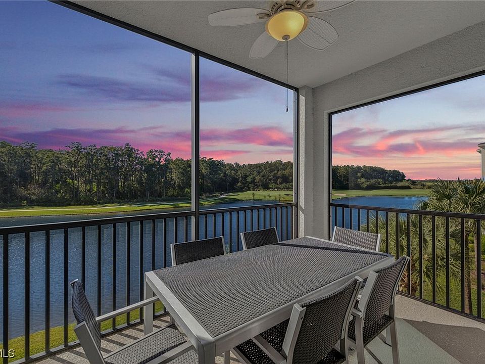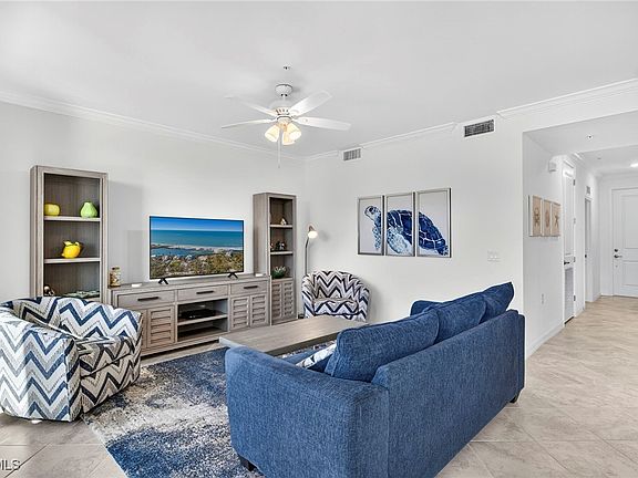 Here's your opportunity to embrace year-round golf within The National because this unit has the GOLF MEMBERSHP INCLUDED! Just bring yourself and your suitcase because this home is being sold turnkey-furnished. This is known as the "Birkdale" layout. This model comes with 2 bedrooms, 2 bathrooms, about 1,200 square feet of living space, an exterior storage unit AND a 1-car covered parking space. Additionally, this unit is accessible by the stairs or the common elevator. Walking inside and through the main hallway, you'll head right into your open kitchen which overlooks the living room and lanai. Finishes included in your main living spaces include everything from sleek quartz countertops with an oversized island, stainless steel appliances, crown molding, tile flooring, white cabinetry, and updated ceiling fixtures. With bay windows in the eat-in kitchen and sliding glass doors in the living room, you have the luxury of enjoying golf course & water views without even stepping outside! Outside, you have your very own screened-in lanai with panoramic views. Views that are hard to beat. Sellers also added a ceiling fan out there for additional cooling! Back on the opposite (entry) side of the condo, you have your 2 spacious bedrooms and bathrooms. Your primary bedroom offers a large walk-in closet, linen closet, and a beautifully tiled walk-in shower while your guest bedroom has a closet and it's own nearby bathroom. It's meticulously maintained and it's move-in ready! Outside of your home and within the gates of The National Golf & CC, boasts an 18-hole championship golf course, a large resort-style pool, a Chickee Bar, 6 Har-Tru tennis courts, 8 pickleball courts, and 2 bocce ball courts. Living here means more than just residing—it's a vibrant lifestyle and experience. Outside of the gates, you can enjoy North & South Parks, a water park, Ave Maria University events, local dining, shopping and so much more! Come experience everything you need in the fastest growing area in Naples!