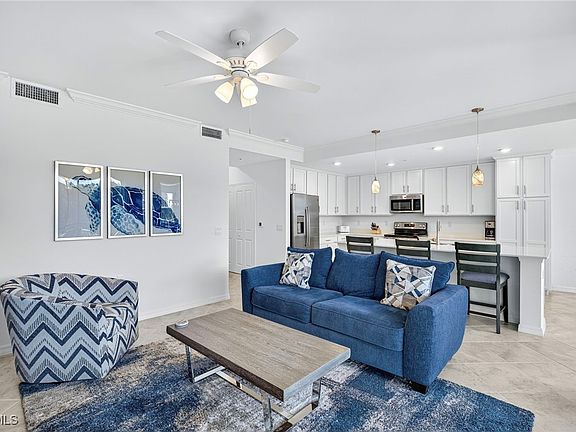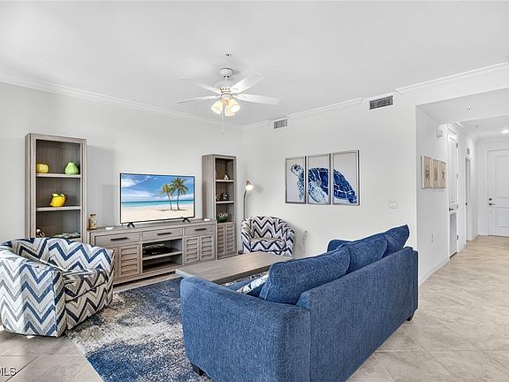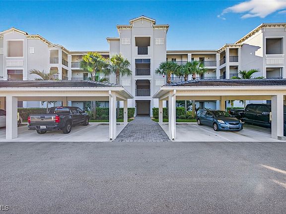 Here's your opportunity to embrace year-round golf within The National because this unit has the GOLF MEMBERSHP INCLUDED! Just bring yourself and your suitcase because this home is being sold turnkey-furnished. This is known as the "Birkdale" layout. This model comes with 2 bedrooms, 2 bathrooms, about 1,200 square feet of living space, an exterior storage unit AND a 1-car covered parking space. Additionally, this unit is accessible by the stairs or the common elevator. Walking inside and through the main hallway, you'll head right into your open kitchen which overlooks the living room and lanai. Finishes included in your main living spaces include everything from sleek quartz countertops with an oversized island, stainless steel appliances, crown molding, tile flooring, white cabinetry, and updated ceiling fixtures. With bay windows in the eat-in kitchen and sliding glass doors in the living room, you have the luxury of enjoying golf course & water views without even stepping outside! Outside, you have your very own screened-in lanai with panoramic views. Views that are hard to beat. Sellers also added a ceiling fan out there for additional cooling! Back on the opposite (entry) side of the condo, you have your 2 spacious bedrooms and bathrooms. Your primary bedroom offers a large walk-in closet, linen closet, and a beautifully tiled walk-in shower while your guest bedroom has a closet and it's own nearby bathroom. It's meticulously maintained and it's move-in ready! Outside of your home and within the gates of The National Golf & CC, boasts an 18-hole championship golf course, a large resort-style pool, a Chickee Bar, 6 Har-Tru tennis courts, 8 pickleball courts, and 2 bocce ball courts. Living here means more than just residing—it's a vibrant lifestyle and experience. Outside of the gates, you can enjoy North & South Parks, a water park, Ave Maria University events, local dining, shopping and so much more! Come experience everything you need in the fastest growing area in Naples!